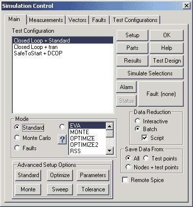 Standard, Monte, Optimize, Sweep, Parameters, and Tolerance in