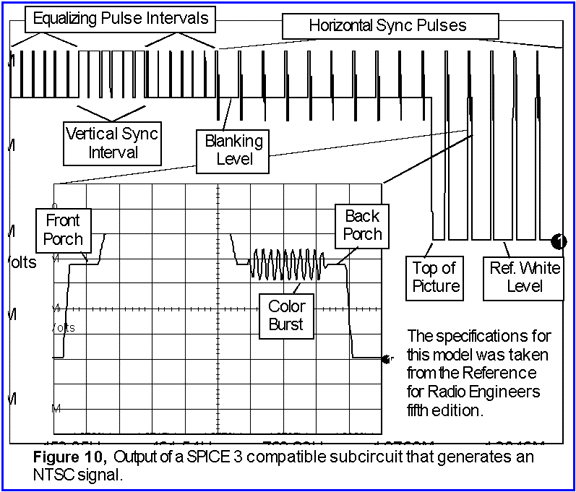 The standard for television transmission in the US is defined by the FCC and known as the NTSC signal. This signal contains visual and aural data for transmitting the television image and sound. The NTSC subcircuit contains only the timing information found in the NTSC signal (Figure 10). The aural and visual information is not included. The components of the NTSC signal are multiples of the chrominance subcarrier frequency (Color burst). For this reason the NTSC subcircuit accepts the chrominance subcarrier frequency as a parameter and processes the components based on the frequency passed into the subcircuit. By default the frequency is set to 3.579545MegHz. Since the allowed tolerance is 10Hz it is unlikely that this default will need to be changed. Two additional parameters are provided; RFL representing the reference white level and BLANK representing the blanking level. Their defaults are 0 and 0.75volts, respectively.