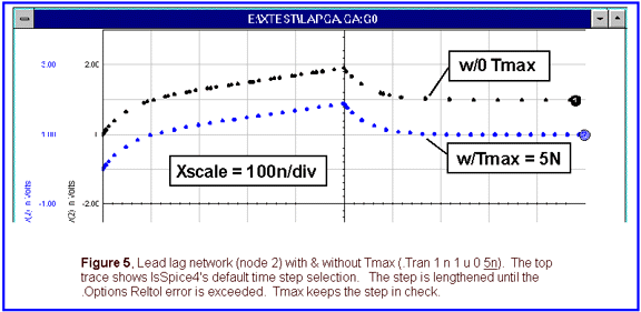 On the other hand, the time step used in a state space formulation must be small enough to provide numerical stability. The ISSPICE4 algorithms do an excellent job of automatically adjusting the time step as seen in Figure 5. Using the convolution method, Pspice v6.1 took 10.88s (4890 iterations), while ISSPICE4 took 3.9s (1636 iterations) on a Pentium/60 (Figure 6). The forced time step limiting causes Pspice to be slower than ISSPICE4 by over 275%. You can actually improve on ISSPICE4s internal algorithms by setting the TMAX parameter to about one half the fastest time constant to prevent the continued scaling back that occurs in ISSPICE4 automatically when the timestep become too large. By overriding the automatic TMAX selection, you can reduce the total number of iterations, and therefore, simulation time, by as much as 50%. For the lead lag example, this means dropping from 1636 to 987 iterations.