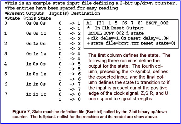 The state machine is configured through the use of a separate ASCII text file defined by the model parameter State_File. The file defines all the output states plus the input data combinations which trigger state changes. An example state file for a binary counter is shown in Figure 7 along with a sample .Model statement. You can see from the file that the output is a binary counter that changes state on either a high or low input. The value of the single input bit determines whether the counter counts up (in = 1) or down (in = 0).