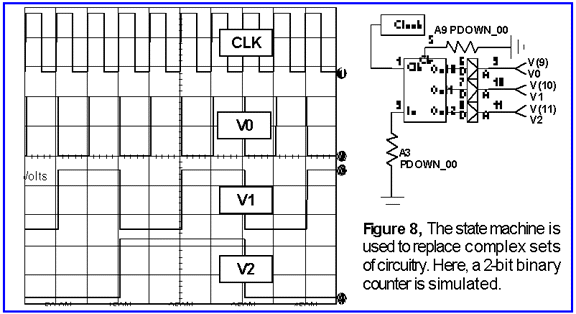 The state machine is quite useful since the state diagram, or state table is normally available before the circuit is con- structed. The output for the counter is given in Figure 8. ISSPICE4 is the only Windows version of SPICE to have this capability.