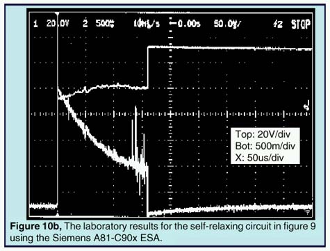 The first IsSpice4 test is made using a self-relaxing configura-tion as depicted by Figure 9. Since the phenomena are very fast, you will need to view the raw non-interpolated SPICE data (internal calculated data points) simulated by IsSpice4 and not the interpolated (.PRINT) data specified by the TSTEP parameter in the .TRAN statement. Thanks to IntuScope, ICAPs waveform analysis tool, you can easily explore both types of data. Figure 10a depicts the results given by IsSpice4. Figure 10b shows an oscilloscope hard-copy of the actual tested circuit.