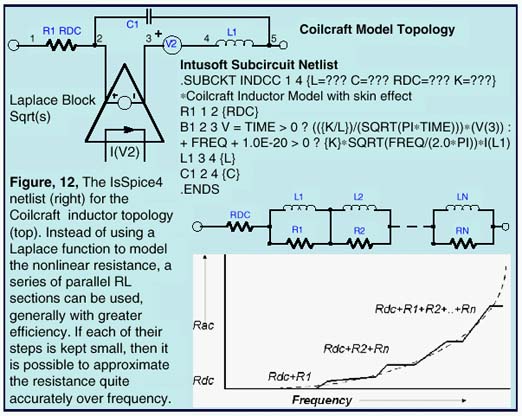 Figure 12 shows an equivalent schematic of an inductor as described by Coilcraft (www.coilcraft.com) in their DOC158-2 app note [1]. The coilcraft topology uses the square root of s, implemented using a Laplace expression, to model the skin effect. Skin effect can also be modeled using a network of linear components [2]. For example, Magnetics Designer uses a series set of parallel RL elements as shown in Figure 12. This technique is more efficient and less prone to simulation timestep problems than the Laplace approach.