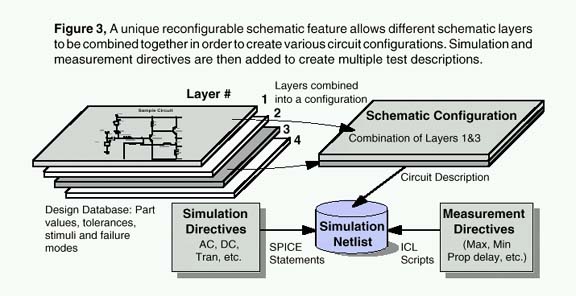 The need for a reconfigurable schematic capability becomes even more mandatory when we analyze the needs of the failure analysis and test program development software (Figure 2). In order to be effective, the simulation process can not become burdened with the bookkeeping intricacies of multiple schematic variations and analysis specifications. The designer must have a way to connect various stimuli and loads to core circuitry and to group different SPICE analyses and test measurements with each schematic configuration.