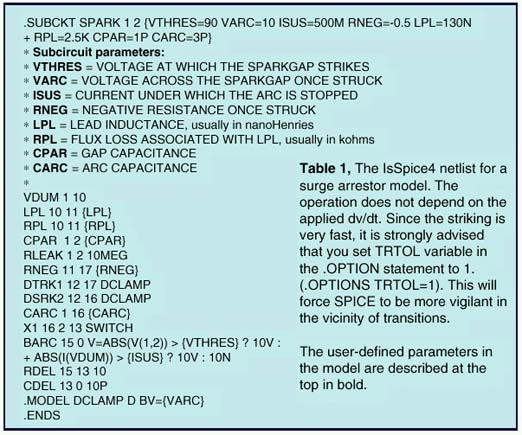 A pre-made set of surge arrestor models for various manufacturers devices is available as part of the new Mechatronics model library. The library will be available November 3, 1997. More details on the Mechatronics library will be available in the next newsletter.
