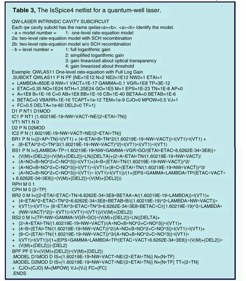 The first cavity model is based on the two basic rate equations, one for QW carrier concentration, the other for photon density in the active region. The second cavity model includes a third rate equation for carriers in the barrier, or confinement, layers adjoining the QWs. Unimolecular, radiative, and Auger recombination are each accounted for in the model. Furthermore, one of four different gain terms can be chosen. These terms include both logarithmic gain expressions as well as linearized ones. Finally, the parasitic elements of the model can account for series resistance, additional series diode effects, and shunting resistance or capacitance. Unlike a typical model implementation within SPICE, the laser model is included as a subcircuit. (Table 3).