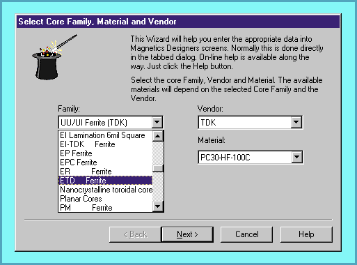 Figure 2, The new Design Wizard helps lead you through entry of the required parameters: Core Family, Material, Wire Type, Operating Frequency, Voltage/Current per winding, and allowed Temperature rise. Entering design specifications is a simple matter.