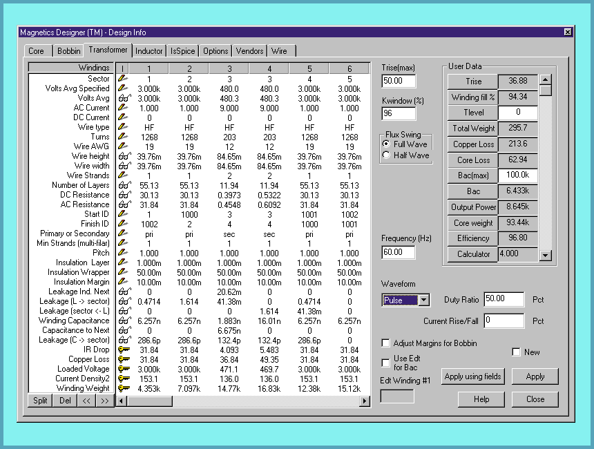 Figure 3, The expanded Transformer screen displays more winding information. Major enhancements include the ability to handle split bobbin configurations and more versatile specification of the current waveform. A Fourier series is computed for the specified pulse waveform duty cycle and rise/fall time. New Finite Element Analysis (FEA) algorithms give you more accurate calculation of the AC losses.