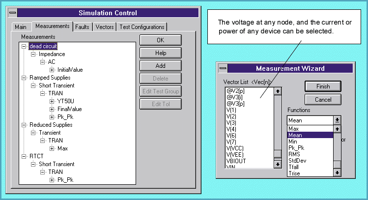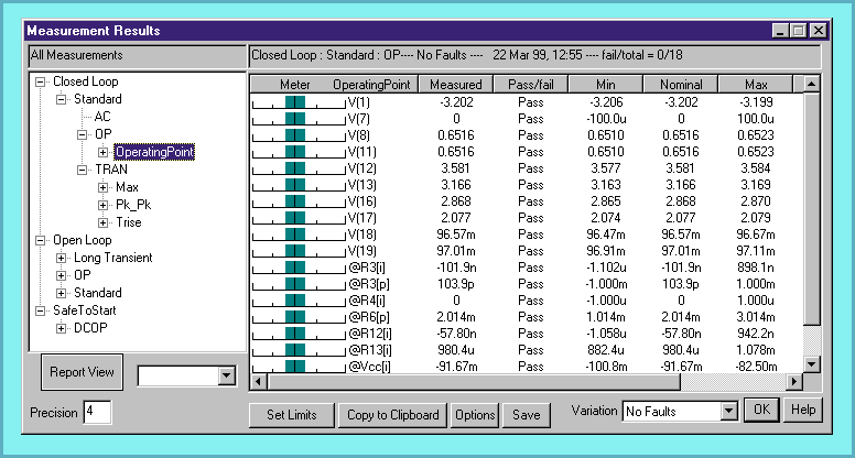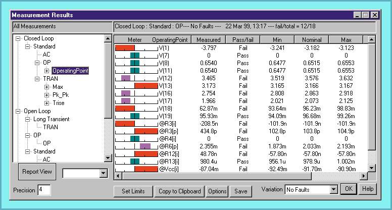 Figure 6, The measurements (Measured column) are recorded automatically after the simulation is complete, and are compared with the nominal values. Variations against the test limits can be easily seen using the Meter column.