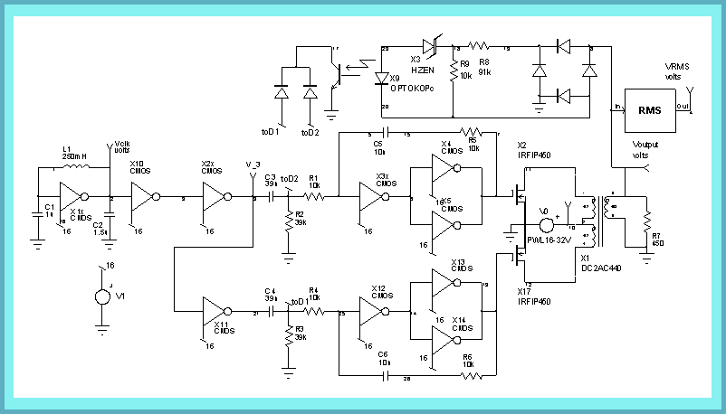 The power MOSFETs work in a push-pull mode. No net direct current flows through the center-tapped transformer, thereby reducing its size and weight. In a similar manner, all even-order harmonics are cancelled by symmetry (Figure 8). Stabilization of the output voltage is accomplished by a feedback loop that regulates the pulse width of the gate waveforms for the power MOSFETs. Figure 8 shows that with increasing DC-supply voltage, V0, the pulse width of output voltage decreases accordingly, keeping its RMS value at a constant level.