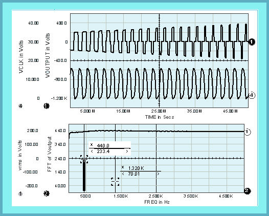 Figure 8, Plots of the output and clock signals (top graph), the RMS value of the output (lower plot, waveform 1), and the output frequency response. As the FFT of the output shows, even harmonics are suppressed.