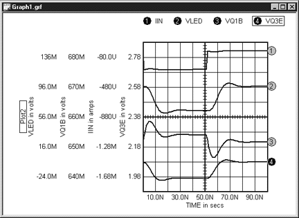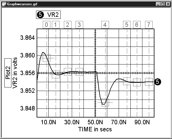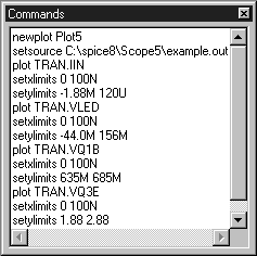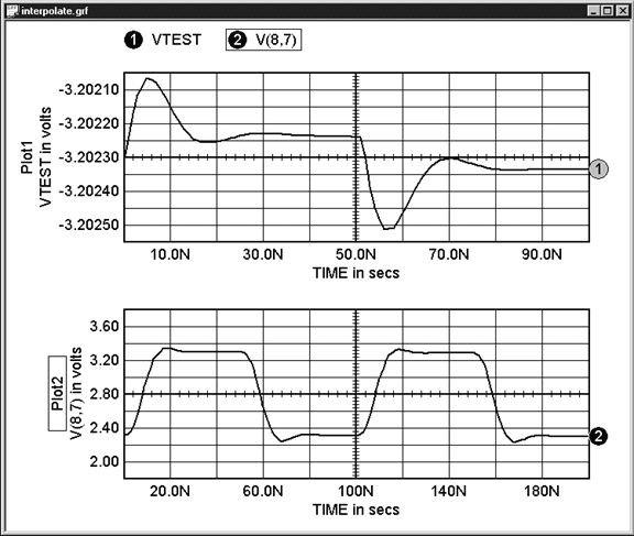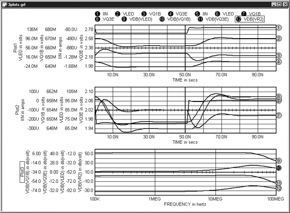 Several plots can now be displayed within a single graph window (Figure 9). You can mix and match different plot types, i.e. Tran, AC, etc. A new function has been added so that you can automatically create a new plot on-the-fly when a selected waveform is displayed.