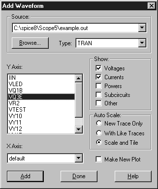The new Add Waveform dialog (Figure 1) is used to select the active project. The project may be the active simulation (for ICAP/4 or Test Designer users only), or a prior simulations output file. Check boxes are provided so that you can globally show or hide specific waveform types within the waveform list. Weve also added new autoscale functions so that waveforms can be automatically scaled, tiled, and/or linked as theyre added to a graph.