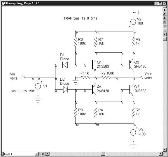Operational amplifiers are typically capable of handling DC voltages in the range from 1.5 to 15V, and their output voltage swing cannot exceed these limits. In situations where higher output levels are desired, a voltage booster can be connected in cascade. In the following example, a dual stage complementary push-pull amplifier is shown (Figure 18). This circuit provides an output swing of +/-100V. As with any DC coupled class-B amplifier, special attention must be given for the stabilization of the operating point. Close matching of D1, D2, Q1 and Q4 is required in order to avoid excessive crossover distortion or thermal runaway, respectively. In the physical layout, D1 and D2 should be replaced with a collector-base connected transistor. Simulations have shown that the biasing scheme is stable over a wide temperature range, when these transistors are of the same type as Q1 and Q4.