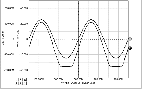 A sweep was then performed in order to study the effects due to the differences in the transistor beta values. The beta value of transistor Q3 was swept from 100 to 190 in increments of 10 (Figure 20). Notice that when its beta was 190, as represented by waveform #9, the negative half-cycle clipping distortion disappeared and maximum voltage swing was achieved.