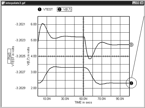 Lastly, a new automatic interpolation feature has been added so that math operations can be performed on waveforms from different simulations, even if the waveforms have different X-axis ranges and different quantities of data points. IntuScope5 automatically interpolates the data points and scales each waveform. The first displayed waveform dictates the X-axis scaling.