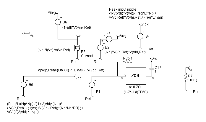 The switched mode controllers set the peak current in the system. To get good correlation, the peak current ripple needs to be added back into the system. The input is then scaled to control peak current. The overall block diagram of the average controller is shown in Figure 5. B5 implements the control duty ratio control law while B4 provides the peak correction. Input parameters are: