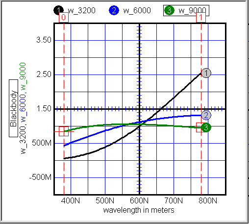 load rule.plt nv = nextvector(null) while nv != null constants.nv = nv nv = nextvector(nv) end setplot constants h = 6.62607e-034 * joule * time k = 1.38e-23 * joule / kelvin c = 300meg * length / time e = exp(1) set units = rad function eb(t,u) ((2 * pi * h * u^3)/(c^2 (e^((h * u) / (k *t)) - 1))) print h k c pi e wavelength = length*(vector(100)/99*400n+380n) newplot blackbody wavelength setplot blackbody w_3200 = eb(3200*kelvin,c/default) w_3200 = w_3200/mean(w_3200) plot w_3200 w_6000 = eb(6000*kelvin,c/default) w_6000 = w_6000/mean(w_6000) plot w_6000 w_9000 = eb(9000*kelvin,c/default) w_9000 = w_9000/mean(w_9000) plot w_9000 set units = deg Example: This script produces a standalone result. Hot Key: None |