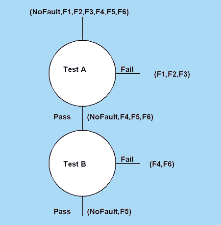 | Figure1 illustrates the importance of a proper test sequence; if test B was perfomed first, there is a high likelihood that failure F1 would be incorrectly diagnosed. When you pick measurements that give solid fault detections, you must make that decision with respect to the faults that are being input to that particular test, not with respect to all faults in the dictionary. It is for this reason that the sequential processing of test intersections using a fault tree gives better fault diagnostics than you get by selecting tests without regard to the guard band or distance between the good signature and the nearest fault signature. |