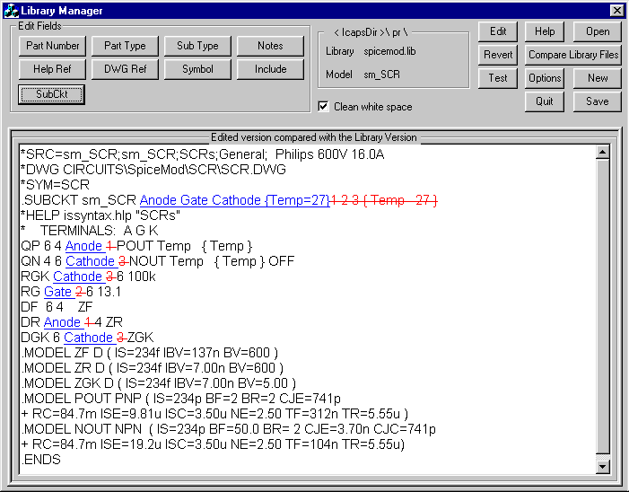 Along with the final release of Scope5, we will have the 8.x.8 update to our ICAP/4 software. This release will serialize (Save) the vsectol option and integrate the new library manager test operation. The Library manager when used in conjunction with Spicemod provides the methods needed to easily test and add your own models to your library so that the parts can be placed on the schematic using the Part Browser dialog. Library ManagerIntusoft libraries are saved in ASCII files. You can edit these files with a text editor; however, many of the formats have a fairly rigid syntax. The library manager takes care of reading and applying this syntax so that the ICAP/4 Windows software can read them. Among the features in the Library Manager is the ability to change subcircuit pin names. You can change the pin numbers into meaningful names like anode, gate and cathode as shown in Figure 2. |
