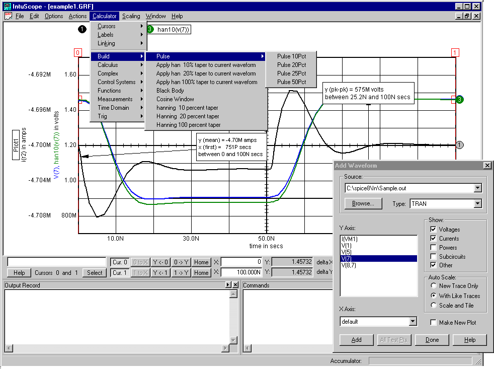 The Intuscope5 program gives you enhanced waveform selection, manipulation, scaling, viewing, and math operations. IntuScope also expanded its menu of features for advanced users. Powerful interactive features, which require communication with the SPICE simulator and the SpiceNet schematic capture program, have also been added. The new IntuScope5 version is Windows 2000 compatible.