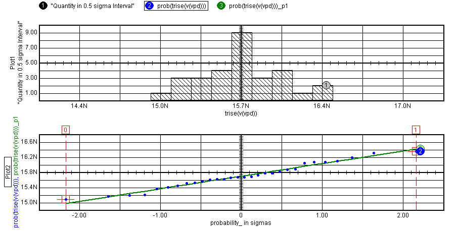 The “prob” plot contains vectors for each measurement. The data in each vector corresponds to the simulation that created it. For cumulative probability, the data is sorted and plotted against a sigma vector. IntuScope back tracks the data by identifying which cell in the corresponding “prob” vector has the same value.