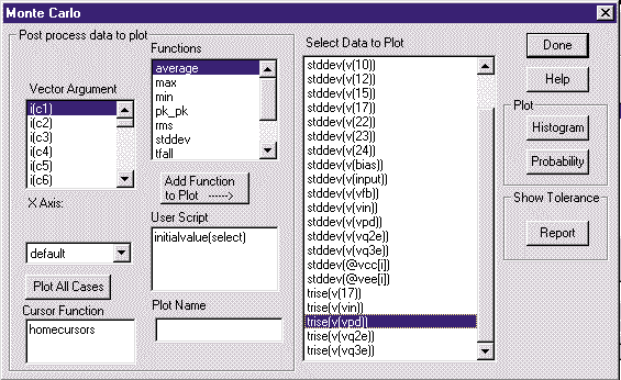 A new dialog in IntuScope can be activated after running a Monte Carlo analysis by pressing the <Monte> button in the <Add Waveforms> dialog. To plot the statistical results, you must have saved measurements in the “prob” plot. You can add to the ones there using the <Monte Carlo> dialog. Selecting vectors and functions from the appropriate lists does this; then press the <Add Function to Plot> button. Incidentially, you can plot all cases of each vector by selecting a vector's x and y axis and pressing the <Plot all Cases> button.
