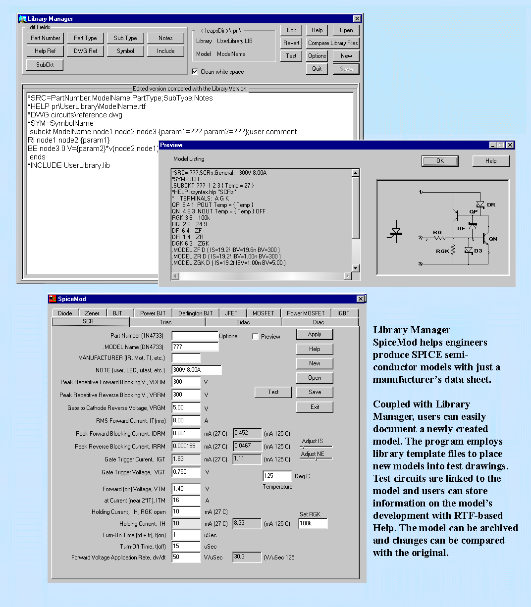 In addition to the new Library Manager, SpiceMod has been converted from DOS to Windows, and its modeling accuracy has been improved. The SCR model now takes temperature as a parameter and allows you to see how temperature affects key parameters within a spreadsheet.