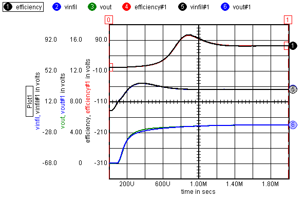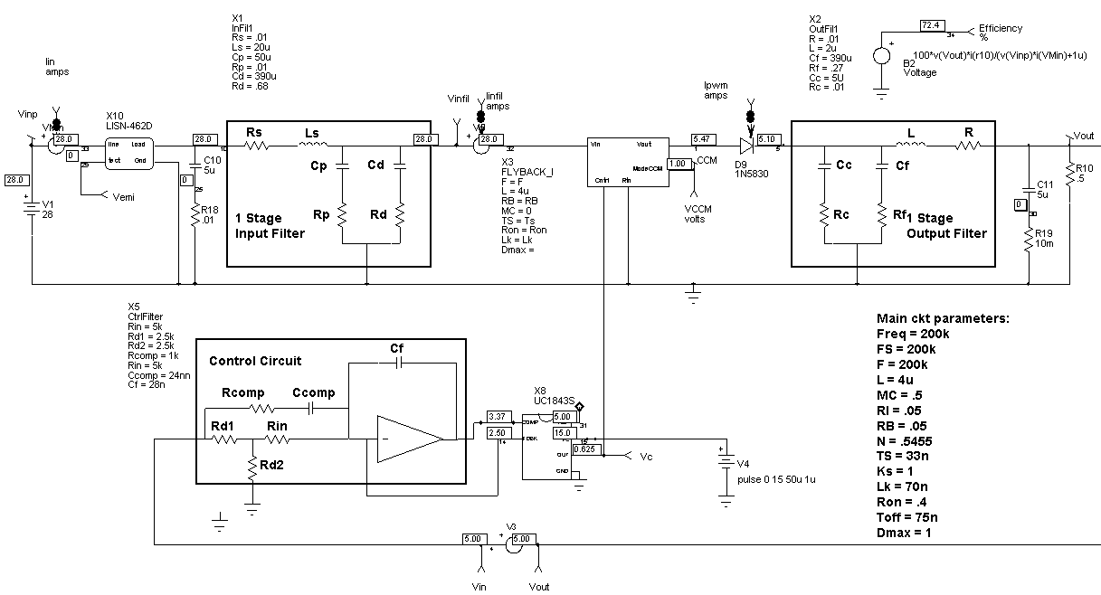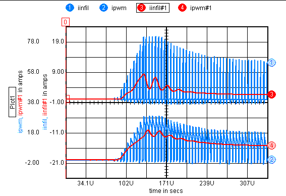 We will add a special case of the inductor design accessed with a Flyback tab or button. The main difference will be the specification voltage for each winding. Power will be specified for all windings except the input winding. You can either specify the input inductance or let the program pick it based on an aggregate thermal model. The aggregate thermal model will add heat from the switch, including that generated as a result of the leakage inductance. When the auto design is completed, you change inductance by adjusting the gap. Edt will be estimated from the duty ratio, frequency and voltage for new designs. Afterward it can be adjusted manually. Intusoft’s new Power Supply Template technology allows circuit designers to start with a power supply topology embedded in a working simulation. The initial release features Forward and Flyback converter topologies. In addition, the average models have been beefed up to include PWM losses and sampling transport delay and, best of all, they work for large signals as well as performing a traditional small signal analysis. Simulations are performed from the appropriate drawing topology. Each topology has a drawing containing multiple configurations. For those interested in exploring the models in depth, one configuration embeds the models in a hierarchical drawing. This technique lets the user push down into the model itself and measure duty ratio, resistive dissipation and dynamic dissipation and more. There are 2 configurations using subcircuits, with and without the loss models. The model without the loss modeling runs faster and is suitable for a number of optimizations. With loss models, the designer gets nearly instantaneous computation of efficiency using the operating point analysis. Finally there is a configuration for cycle-by-cycle switching that is used to validate the average model and to see the transistor switching load-line and measure component transient stress. Templates consist of functional blocks, modeled as subcircuits, that the designer can assemble from the Intusoft library. A drawing is available with the blocks assembled to make a working DC-DC converter. The designer must rescale the blocks for his or her power and voltage levels. This rescaling is done using the fastest performing average model. The average model of a vendor’s PWM chip is then connected to the new generic Average Switched Inductor model to complete the circuit. New worlds of design options are opened up when using the new ICAP/4 Windows optimizer and the large signal average models. The critical performance parameters can be tuned using the optimizer. You can find parameter values that give the best performance before actually building a prototype. Transient response without the switching clutter can reveal large signal instability at turn on absent slope compensation. A limited version is also available in the Intusoft demo version. The demo version includes large signal average models without the PWM losses. Even this demo uses the most advanced PWM model available anywhere. Pushing into the Hierarchy The Flyback Template This drawing uses our configurable schematic to jump between different modeling concepts. Probably the most powerful concept used is the large signal compliant average model. These average models have had a long history of incremental improvement. However; when earlier this year, Intusoft completed a new multi-parameter optimizer, the existing state-of-the-art was missing some important features. First, the existing models wouldn’t give correct transient results. They modeled the steady state solution and figured out whether or not the inductor operates in continuous conduction. But the results were incorrect in the dynamic case. Moreover, losses weren’t modeled dynamically. On start-up, the loss as a percent of power input is much higher than steady state. So, Intusoft stepped back and revisited these models. The result is a new Flyback and Forward average model packaged with this release of the Power Deluxe library. We will be providing a somewhat limited version with our demos and standard libraries. The new model that goes with this release is capable of accurately replicating the cycle-by-cycle switching simulations in a fraction of the time. This improvement in speed is put to use with our optimizer to select component values that give the best performance for your design. What’s really incredible is the calculation of efficiency using a DC operating point analysis. The fastest possible analysis gives up the answer to one of the most difficult problems. Iterating this efficiency calculation with transformers and inductors designed using Magnetics designer, you can be sure that you get the best efficiency at the operating point of your choice. Comparison of Switched and Average Models Figures 3 and 4 compare the run on characteristics of the average and switched models. Remarkably, the average and transient turn characteristics are nearly identical. The average value of the switched currents exposes a moderate oscillation during turn-on that could be easily overlooked in the laboratory. |