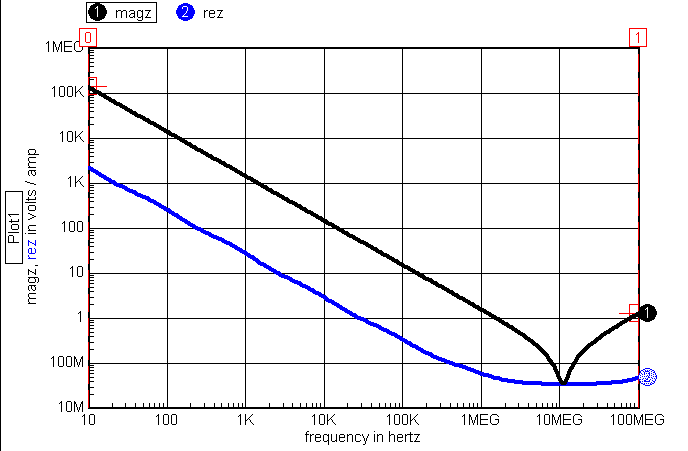 Figure 4. Plot of Magnitude (magz) and Real(rez) versus Frequency. Now, with our new model, let’s explore some common circuits to see the impact of a more accurate model. The circuits we’ll try are: