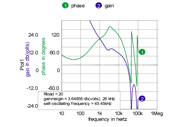 The drain current pulse is formed by charging the Flyback inductance until the voltage across Rsense reaches a fixed threshold. When that occurs, the PWM switch is turned off. The PWM is held off until the next clock pulse after the output voltage drops below the set point. This loop operates in discontinuous conduction mode so that the output and input currents are given by D*.5*L*Imax^2*F/Vout and D*.5*L*Imax^2*F/Vin respectively. For a constant input voltage and load current, the PWM on time is fixed and the duty ratio is controlled by the OFF time. The self-oscillating frequency exhibits some subharmonic oscillation because the internal oscillator synchronizes the turn-on, which is 100KHz for the device shown. To make an average model for the self-oscillating section we must assign a control loop gain that makes this section stable and accounts for the oscillation using Z-Transform derived difference equations. The reason for describing the self-oscillating section as a stable circuit derives from the concept that a system that is oscillating has increased losses that damp the oscillation, forming a stable limit cycle. We observe that the duty ratio of the hysteretic converter can go from 0 to 1 as the control signal traverses the hysteresis band. That suggests that we set the duty ratio to the linear control signal at the output of the opto-coupler divided by the hysteresis width. We would expect to get zero gain margin for that condition. For the average model to be useful, it shouldn’t oscillate so that we divide the control signal by 1.5 times the hysteresis to get about 3 dB gain margin. Figure 2 compares the switching result with the average model for a load switch from 20 Ohms to 4 Ohms at 6ms into the simulation. Bode plots for different loads reveal about the same gain and phase margin with the critical frequency running about .5 times the limit cycle frequency. For a load of 20 Ohms, the frequency for 0dB gain was 26kHz and the switching frequency was 45.4kHz, as shown in Figure 3. |