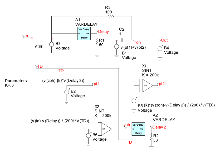 A new Spice element was needed to account for the variation in switching frequency with load. To accomplish this, a code model was made with a variable delay time connected to an input port. In the time domain, it’s just a delay, outputting the historical data according to the requested delay. In the frequency domain, it’s an e^-sT function (Z^-1). It’s combined with a continuous Laplace integrator using a subcircuit model to make a fraction order hold, FOH [1], that works in both the frequency domain and the time domain. The FOH is a generalized model that can be used to simulate a Zero order hold (k=0) on up through a first order hold (k=1) and anything in between. We used k=0 for this model. By properly accounting for large signal dependencies in the difference equations, this “average” model is also a large signal model capable of studying turn-on, line and load steps and other large signal behavior. The improved simulation speed enables us to use the ICAP/4 optimizer to center the design, getting the best performance by selecting just the right component values. With the following definitions, we can develop equations that describe the average model: