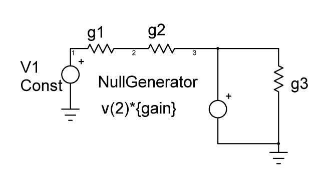 from the injection point to the desired set point. Now we can turn our attention to the notion of what acceptably small means and how much gain should be used. As the gain is increased, then the error signal that is being nulled is reduced. Both numbers must exist as 64 bit floating-point numbers. Suppose we have a simple network of resistors as shown in Figure 7a. The corresponding figures are described in Figure 7b. Figure 7a. A simple null generator and the MNA equations.