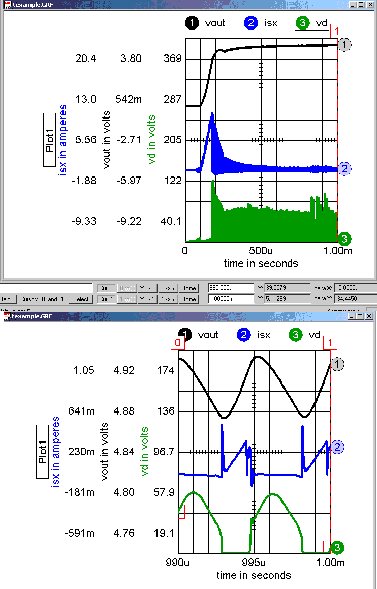 Figure 9. Expand and rescale by setting the cursors to 990u and 1 m; then press x to expand the x-axis scale and press t to tile the expanded region. |