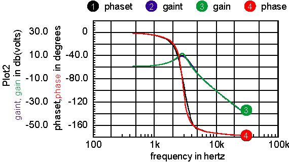 Figure 3: Filter is effective for Tstart > 1.54/Tau Figure 4 shows the result when applying the above equations for a gain of 1 with Fs=500, Fend=25k, Tsweep=100m. Figure 4: The ideal gain and phase should be zero, the gain error in gain is under .05%. Next, the input signal’s DC component needs to be removed because it results in an interfering signal at the injection frequency. This is accomplished by using a sample and hold at the output of a first-order lowpass filter. This DC value is sampled at time Tdelay for both the in and out signals. It is then subtracted from the in and out signals. The sweep rate moves a tracking filter across the 500-to-25kHz frequency range. For narrow band resonance, an error will appear if the sweep time is too fast. Figure 5 shows a typical resonant circuit with Figure 6 showing the results for Tsweep=50ms. Both phase and gain show reduced accuracy because of the relatively fast sweep. Increasing sweep time to 100ms makes the error negligible for this case. Figure 5: An RLC test circuit Figure 6: Transient simulation results compared with the AC analysis for Tsweep=50m; results almost identical for Tsweep=100ms Now, the TFA can be put together into a model. Using the approach taken previously for the GFT models, the user will be required to name the TFA subcircuit XTFA. That allows the measurements scripts to reach into the subcircuit. For example, freq:XTFA is the frequency node. That simplifies the symbol as shown in figure 7. Figure 7: Only pins that are need for interconnection are brought out The model separates the signal, pins Hi and Lo, from the measurement pins, in and out. The separation allows the model to be used either as a single injection GFT type to measure “loop gain,” or to measure voltage transfer functions elsewhere in the control loop. Figure 8 shows how it works with the forward switching regulator used in the Intusoft Power Templates. Figure 8: Comparison of results from TFA simulation; The accuracy of the TFA measured data is dependant on signal strength. It may take some adjustment to get the “right” answer. Internally, the sweep signal is connected from cos:XTFA to cosx:XTFA, using a 1k resistor. It is then multiplied by a ramp function and the Vsigpk parameter. You can modulate its value externally by connecting a PWL function between cos:XTFA and cosx:XTFA. Generally, you can increase signal strength at higher frequencies when the loop gain is small. Clearly you don’t want to use the time domain TFA if an average model is available. But if an average model doesn’t exist for your specific application, it may take several days to make a new model. An extra hour or so of simulation time is a good trade-off. And, there are topologies such as some resonant converters, that have no suitable theory for making an average model. But be aware, the long simulations will push your memory limits, so consider upgrading to 1 or 2Gbytes of RAM and even getting a faster machine! |