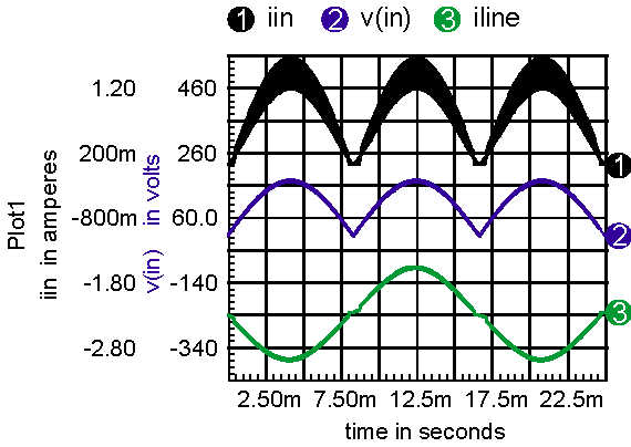 Figure 11: An ideal PFC and its waveforms with Don limited to .95. The circuit runs into trouble as the input voltage and current approaches zero. Output voltage at steady state is given by Vout = Vin/(1-Don). Typically, Don is limited to something like .97, so that maximum boost in Vin/.03 = 33*Vin. Note: if there was no Don limit, then the circuit could get stuck at Don=1. When the switch capacitance is included, the boost limit can be compromised further because of the finite rise time of the flyback waveform. When the flyback voltage is less than the output voltage, there is no output current flow. When a current is switched into an L-C network, the voltage is a ringing sine wave. Solving for the time to rise to Vout requires computation of the inverse sine function, asin(). Even more interesting is the apparent resistance of the MOSFET, due to capacitive charge and discharge when there is no output conduction. That creates a resistive load at the input, which further reduces the waveform distortion. Figure 12 compares an ideal boost limited model with one that includes switch and diode capacitance. Figure 12: The expanded line-current waveforms illustrate the effect of adding MOSFET and diode capacitance in waveform 1. It’s possible to introduce the behavioral equations for asin() and the nonlinear load, using table models that circumvent the calculation of out-of-bound derivatives. These techniques have been incorporated in the NCP1650 average model in our power library. |