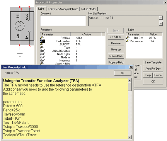 The TFA model is located in pwmprim.lib, and its symbols are in TFA.sym. Property help is in <Icapsdir>\pr\pwmprim\TFA.rtf. Property help is accessed from the label dialog as show in Figure 9. Figure 9: Dialogs shown after double clicking on the TFA symbol and pressing the property help button. You can copy and paste the parameters into a text block on the schematic. Text blocks labeled “parameters” in their first line will have the parameters inserted when the simulation is run. For builds > 2450, you can place parameters in the transient analysis setup as shown in Figure 10. |