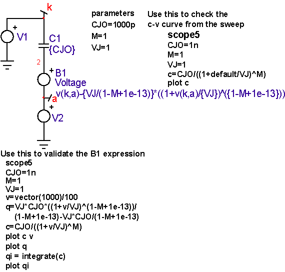 | Nonlinear capacitor models are required for any capacitor whose capacitance, C(V), is a function of the voltage applied to it. Using basic analog behavioral modeling tools in IsSpice4, such a non-linear capacitor model can be developed. Consider the model shown in Figure 13 below. Figure 13: Nonlinear Capacitor Model The model is made up of an ideal capacitor C and an arbitrary voltage source. The main task is to find an expression for B1 that will make this combination work as a nonlinear voltage-dependent capacitor model. Note, as indicated in Figure 13, the voltage for the new model is the sum of the voltage across the ideal capacitor and the voltage expression f(v) describing the B1 source. As an example, let’s define an effective capacitance as follows: Then, integrating with respect to v, and using basic circuit theory for the ideal capacitor (Q = C(v)*V), the following expression is obtained for the new model: Now we can solve for f(v), which is the expression needed to complete the model. The schematic (varicap.dwg) complies with this equation. It’s in close agreement when using a constant capacitor of value