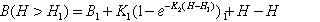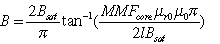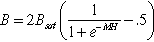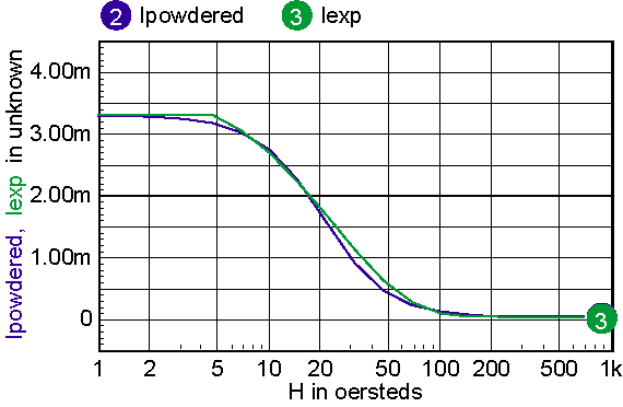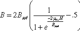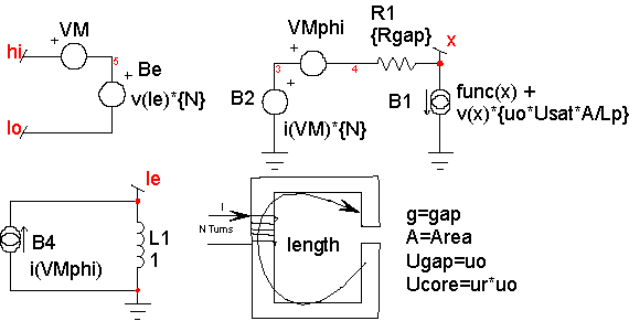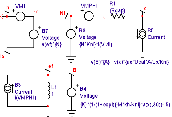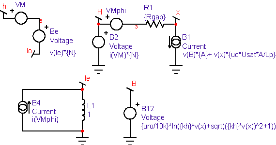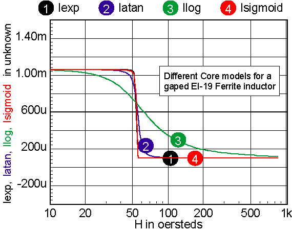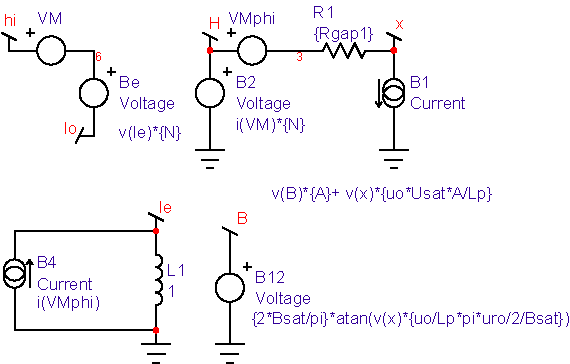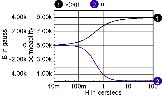 Notice that for all of the models, a Usat term is added in the B1 current (Flux analog) source. Usat is usually set to 1, the relative permeability of free space. It may become convenient to give it a larger value to fit data for very high magnetic fields. The next shape is the sigmoid B-H curve. It’s extremely sharp and can be used for square-loop material such as Orthonal or Permalloy. Starting from the B-H curve, the sigmoid is defined as: