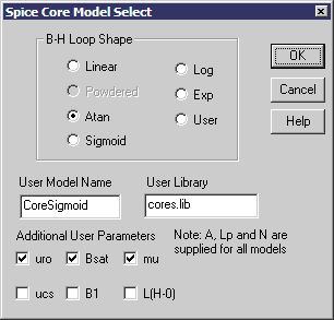 Many requests have been made for nonlinear core models, particularly for the SPICE models that come from the Magnetics Designer software. Magnetics Designer has some nonlinear parameters available internally, so that it’s possible to make an accurate model for many cores. The powdered cores, in particular, are valuable candidates for automated models. Adding the extra complexity to the model is generally unnecessary if a design doesn’t near saturation. The saturation limits can be computed and an alarm set to warn of potential problems. However, some designs allow the core to enter saturation with the circuit itself limiting the stress. Peak current-limit pulse width modulators are among this kind of circuit. The approach taken for the new Magnetics Designer update is to allow the user to select from a number of different models, including the existing linear model. These core models have also been included in cores.lib that is distributed with the power supply library, and the newsletter subscription. Pressing the new Core Select button in the IsSpice tab brings up the Spice Core Model Select dialog shown in Figure 1.
