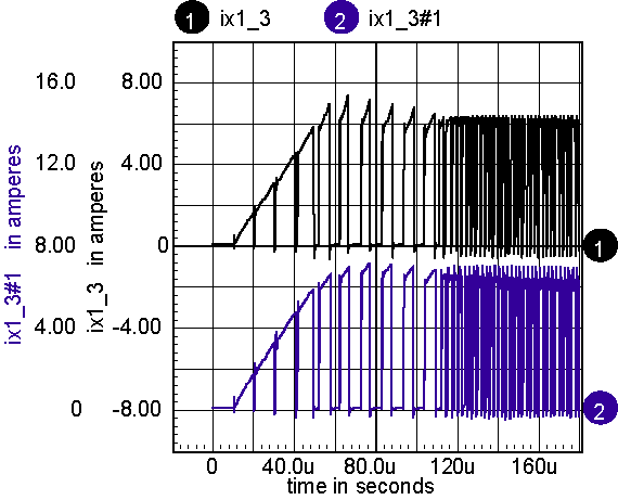 Accurate modeling of inductance requires a good estimate of the permeability-H characteristic. Then the function in the model, func(x) in Figure 4, is formed by integrating the permeability curve. Inductors are made by using a magnetic material in combination with an air-gap. The gap can be introduced as a discrete gap or as a distributed gap. The most common way of making a distributed gap is by mixing non-magnetic filler with powdered magnetic material. Discrete gaps are made by inserting a dimensionally stable material, such a paper, between the core pieces. The inductor’s core can be modeled using a table, or by finding continuous functions that approximate the B-H characteristics. Continuous functions are less susceptible to discontinuities, and as a result they should work better in a simulator. When using a table model, the most commonly available data is from a B-H curve. Inaccuracies in transcribing the data from a data sheet curve to a table will result in magnifying the error in the permeability function (that’s because permeability is the derivative of the B-H curve). The B-H curves must be carefully filtered and their derivatives tested to assure a stable simulation. On the other hand, continuous functions can be fit to permeability-H curves using optimization techniques. Errors in transcribing data are reduced statistically, and because the continuous functions tend to describe the device physics. Many data sheets give what appear to be valid continuous functions as the ratio of polynomials. The problem with this approach is that the polynomial ratio departs from physical reality outside the region where data was used to make the best fit. This shortcoming is illustrated in Figure 6. It also illustrates how easy it is to use the IntuScope waveform viewer to evaluate and plot equations.
