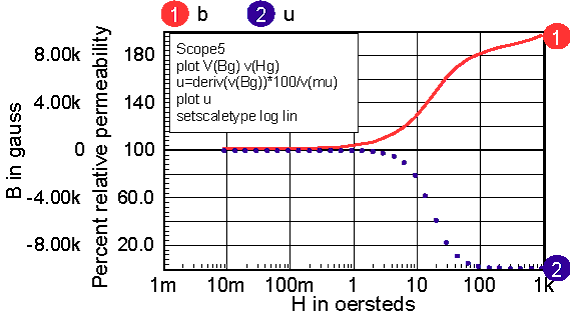 Next, the u-H plot can be obtained by differentiating the B-H plot. The differentiation in the model uses an inductor to differentiate current and feed it back as a voltage. But that process requires time domain or frequency domain analysis. A simple DC sweep with post-simulation differentiation achieves the same objective, and with a lot less computational effort. Figure 3 illustrates the result.