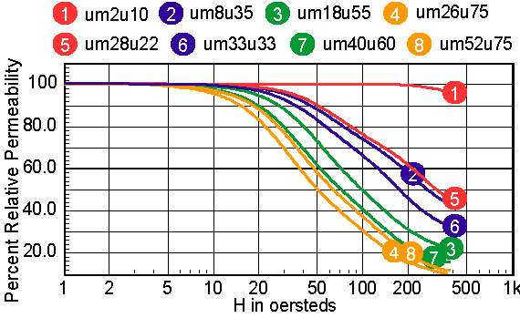 Powdered cores exhibit a larger swing in H for the same percentage change in permeability. The reason for this is because the powdered particles will saturate first where they are almost touching each other, slowly increasing the air gap as the magnetic material saturates. Solid cores with a single gap tend to saturate uniformly so that the permeability drops more rapidly. The packing arrangements and shape of the powdered particles vary, based on the manufacturing process. The solution of Maxwell’s equations in a closed form function is unknown, even for simple packing geometry. We will get around this problem by examining several reluctance models based on four generic solutions. Continuous functions for permeability are useful for defining the