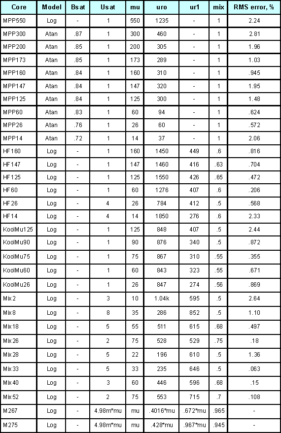 For cores that have distributed gaps, such as MPP or Kool Mu powered cores, a special reluctance model is used. In general, two cores are made in parallel, each with its own gap. The mix parameter tells how much the first core contributes to the H=0 permeability. Note: parallel cores correspond to series inductors. Table 2 shows the combination of free parameters used to get the best fit to the published Table 2: parameters for powdered cores The RMS error is in general based on data for percent initial permeability = 80,50,20. When these permeability values can’t be achieved, three different values are substituted. The accuracy to which the charts can be read is larger than the error in the curve fit. Moreover, the initial permeability tolerance is much greater than the curve fit tolerance. Most inaccuracy occurs for percent permeability below 10%, or for deep saturation. Figures 12-16 show the percent permeability verses H for the families in the above table. It is recommended that the atan model be used for other ferrite cores, and the sigmoid model selected for solid cores. Provisions are made for making your own user models, and connecting them to the Magnetics Designer SPICE model. All of the non-linear models use the IsSpice4 syntax and need to be translated if you use another simulator.
