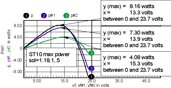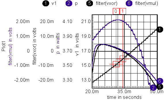 The FET resistance modulation scheme will be used for the low cost analog peak power tracker. The final product, where dp is multiplied by v(10), can actually be considered to be a phase detector. That’s accomplished by using the polarity of v(10), which is used to select the positive or negative dp result. Moreover, dp can also be limited, and the result is accomplished using an exclusive or gate. Figure 20 shows the result, comparing the xor with a multiplier for sol=.5. The schematic for this test case is in the drawing file named MPPT_MUL1.DWG. The PWM control was set to voltage mode and the array voltage was swept from 12 volts to 21 volts from about 20ms to 50ms. A 1 kHz dither signal was inserted in the control loop such that the AC array voltage was the same for all DC sweep values. Notice that the ripple in power minimizes at the peak power point.
