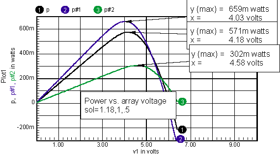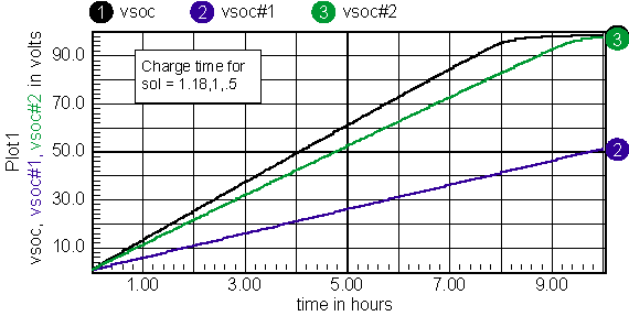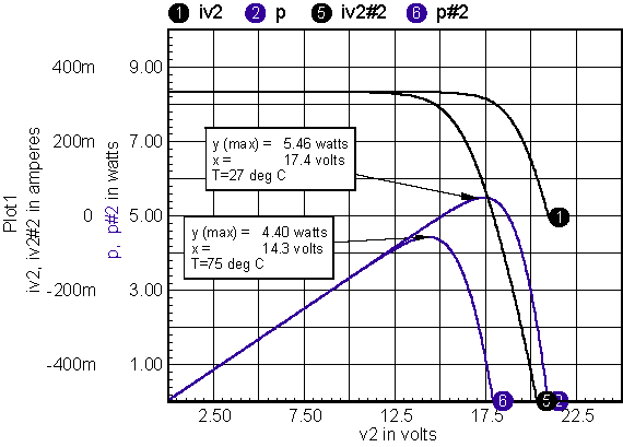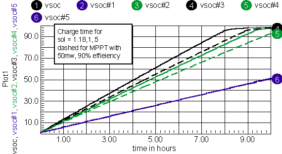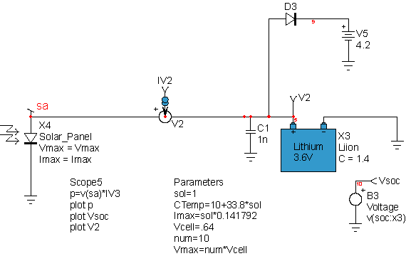 In the first case, the number of series cells is varied so the “best” combination is chosen to work over the expected operating temperature range. Figure 4 shows the schematic, and resulting data is shown in Figure 5. The charger works best when the peak power voltage exceeds the battery voltage. If the maximum cell temperature is 60 Deg C. then 10 cells are required. The parameter calculation uses the cell-temperature estimate developed earlier, and adds the concept of a normalized incident radiation, sol, where sol=1 for AM1.5 conditions. Notice the voltage clamp using D3 and V5. Lithium-Ion batteries must not be overcharged for safety concerns. The voltage clamp, along with short circuit protection is internal to consumer cells. OEM cells require the manufacturer to provide safety features that include: