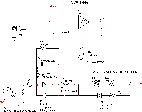 In the paper by Suleiman Abu-Sharkh and Dennis Doerffel [3], a battery model is described for a high power Lithium-Ion battery. An IsSpice4 model was made using the techniques and data described, and it was scaled down for use with a C cell (1.4 amp-hr, 3.6 volt). Figure 3 shows how the IsSpice4 model is implemented. Diodes D1 and D2 replace the zener diode in the Abu-Sharkh model. The nonlinear resistor, R01, is implemented using diode D3 and controlled current source B6. The scaled model tends to agree with various manufacturers published data.