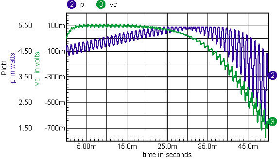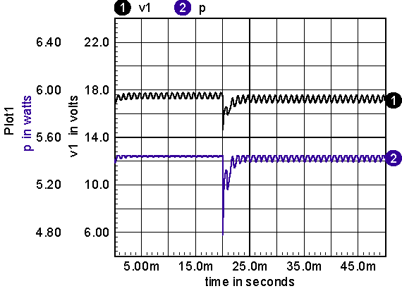 The only substantial benefit for MPPT tracking is to increase the SOC from 54% to 60% in the winter. That would not seem to justify the increased complexity in this application. So, when would you use peak power point tracking? Evidently the overhead in terms of power and circuit complexity must justify the inclusion of MPPT. For battery chargers, once you get to a 100% state of charge, then nothing you do will improve the situation. That means MPPT is only useful when the solar radiation is low, or varies a lot in cloudy climate. Even then, it’s only a 10% or so improvement, which is easily gained be increasing the size of the solar panel. On the other hand, if the battery is oversized, it will never fully charge and the maximum energy can be recovered. That’s equivalent to returning energy back to the power grid. Moreover, when energy is returned to the power grid, there must be a switching power supply so that its inefficiency doesn’t penalize the MPPT. These larger systems won’t notice the housekeeping power loss. Saving 10% on a $50,000 installation is certainly worth adding MPPT, even at the cost of a microprocessor. The peak power operating point can be tracked using a controller, or by using an estimate based on array temperature. In either case, the controlled state variable must be chosen. Normally the output current would be selected. But the output current is proportional to power and there will be two possible operating points. Notice that dv and di can be considered “small” signal parameters. So, if a relatively low frequency AC signal is introduced into the system, then di and dv can be extracted using a band-pass filter. Then the value at the dither frequency can be evaluated by demodulating the result. Now, here’s where simulation can be used to design the control system. Rather than writing the equations, the simulator can be used to evaluate the control law and set scale factors. Figure 14 shows how that’s done for the default array. First, the previously discussed solar panel model is used in X3, then X1 models a buck regulator operating in continuous conduction mode. Nodes dv and di are the dither signals extracted as though they are the only AC signals present. Later-on the PWM switching signal must be filtered. B2 is the control law for making the array voltage equal to the control signal. Finally, Vc is metered to see how it varies as the array voltage is swept using the control signal, Vs. Vs includes the dither signal from V2. Figure 15 shows the transient simulation results. Next, the signal from Vc is used for control and a step change in load is introduced to check on loop dynamics. This was accomplished by changing the B2 expression to