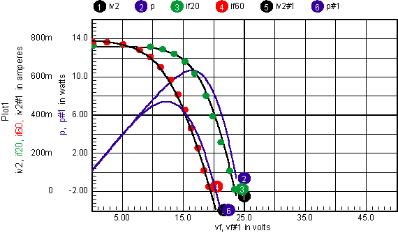 Several additions to the model are needed for the Poly crystalline array. First, in 1996, Zekry, et. al. [4], pointed out that lateral resistance in the array could be modeled by using a distributed model, that is, parallel diodes and photocurrent generators connected by resistors. If 4 such sections are used, the problem can be reduced to 2 sections by recognizing symmetry between the 2 anode contacts. Adding this affect gets a fit at higher array voltages (high diode current). Next, the generation-recombination current needs to be included. This was done by adding a parallel diode with 2*N emission coefficient. The extra diodes series resistance and saturation current were used as free parameters to make the best fit to the data. Figure 10 shows how the model compares to the published data at 20 and 60 Deg C for the Shell ST10 module. Figure 11 shows the model schematic.