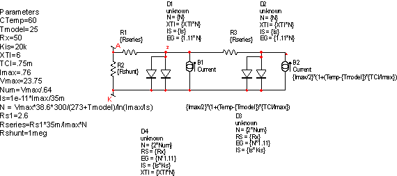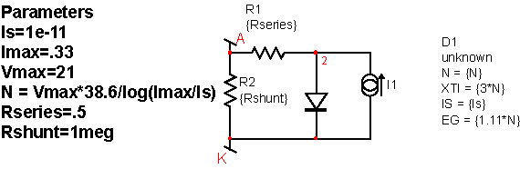 It’s assumed that solar cells are connected in series to achieve the desired open circuit voltage. Rather than connecting many diodes in series, it is convenient to scale the SPICE diode model. The diode model parameters that have been scaled are: